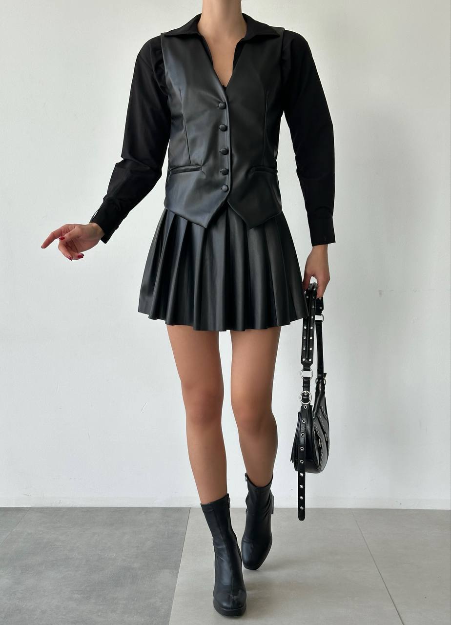 Ένα εκλεπτυσμένο μαύρο γιλέκο από eco leather, σχεδιασμένο για να δίνει κομψότητα και δυναμισμό σε κάθε εμφάνιση. Η minimal γραμμή του το κάνει ιδανικό τόσο για καθημερινό στυλ όσο και για πιο βραδινές, elegant εμφανίσεις.