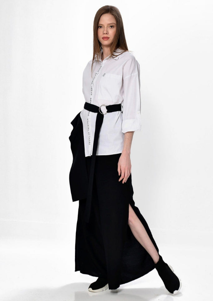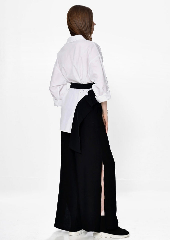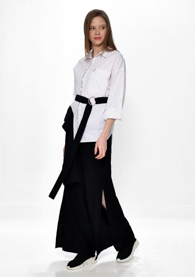 Δυναμισμός και γεωμετρία. Αυτή η παντελόνα επαναπροσδιορίζει το μαύρο κλασικό κομμάτι, ενσωματώνοντας μια φαρδιά ζώνη με μεταλλικό κρίκο και ένα πρόσθετο τμήμα υφάσματος που δημιουργεί κίνηση. Είναι το ιδανικό κομμάτι για μια εμφάνιση που απαιτεί έντονη προσωπικότητα και κομψότητα.