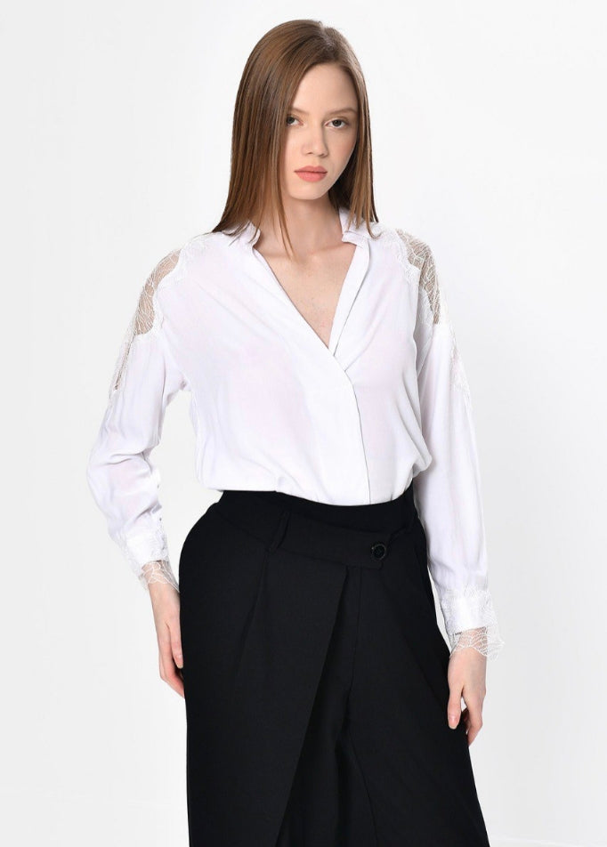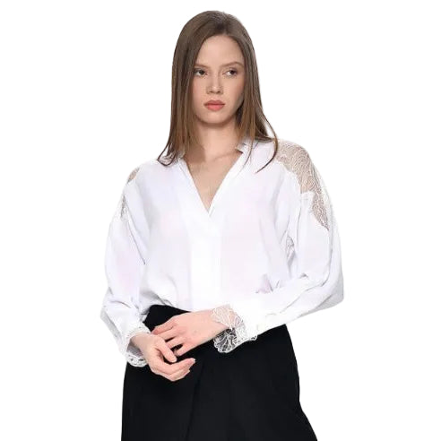 Η θηλυκή πλευρά του κλασικού. Αυτό το πουκάμισο συνδυάζει την καθαρότητα του λευκού με χειροποίητης αίσθησης δαντέλα στους ώμους και τις μανσέτες. Με βαθύ κόψιμο V και ανάλαφρη ύφανση, αποτελεί μια μοναδική επιλογή που προσθέτει μια νότα πολυτέλειας σε κάθε εμφάνιση, από το γραφείο μέχρι μια επίσημη έξοδο.