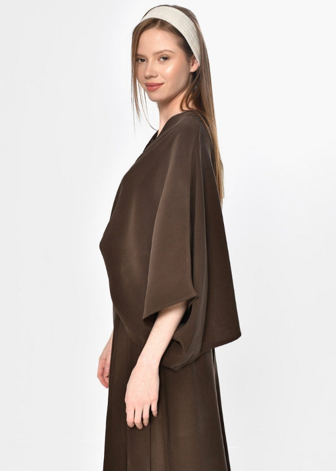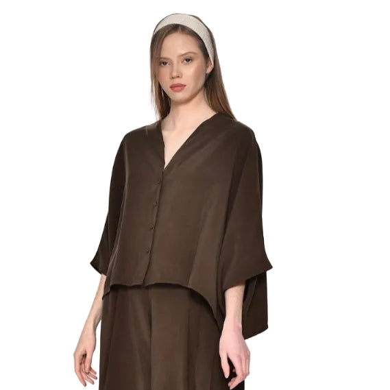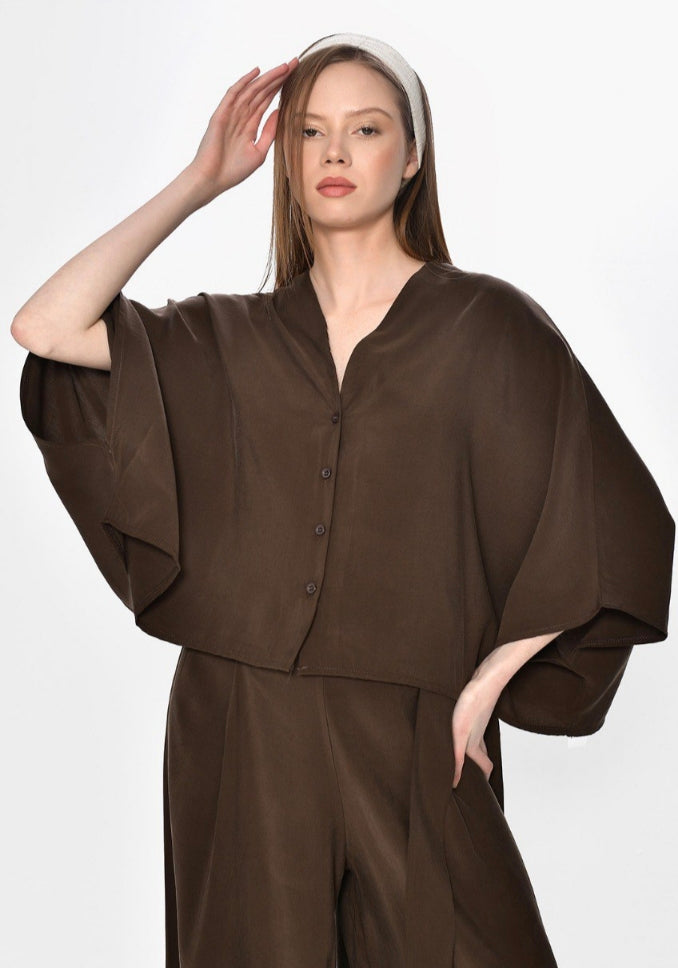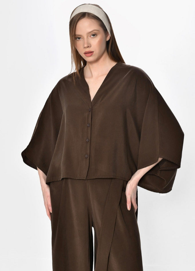 Μια σύγχρονη προσέγγιση στη χαλαρή κομψότητα. Αυτή η πουκαμίσα με λαιμόκοψη V και φαρδιά μανίκια προσφέρει μια εντυπωσιακή σιλουέτα με αέρινη κίνηση. Το ύφασμα έχει εξαιρετική πτώση και μια διακριτική μεταξένια λάμψη, καθιστώντας την ιδανική τόσο για πρωινές όσο και για βραδινές εμφανίσεις.