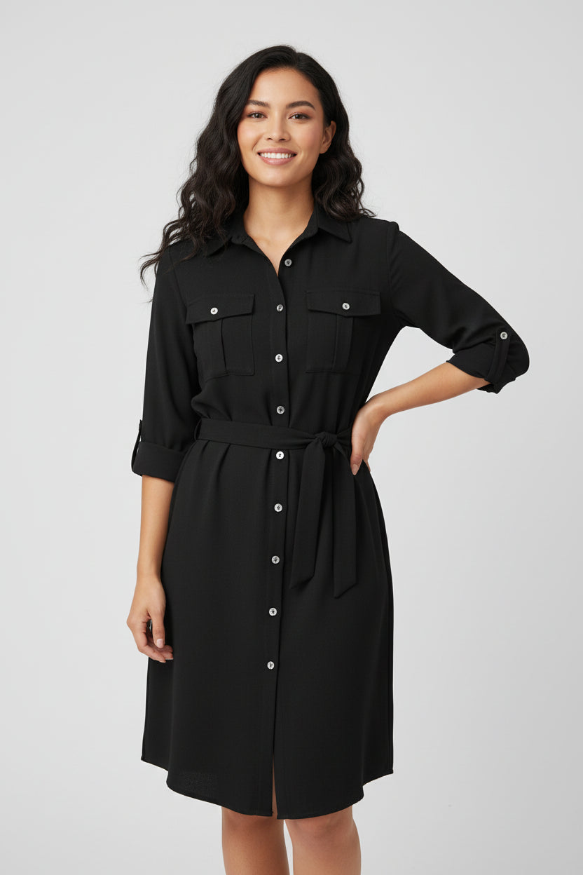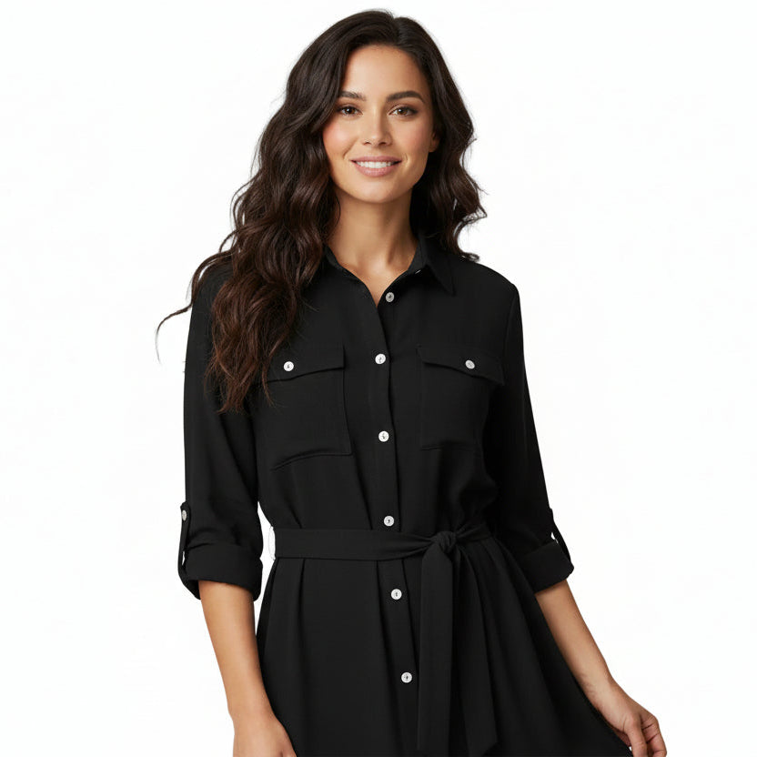 Κομψό και διαχρονικό shirt-dress που συνδυάζει άνεση και στυλ, ιδανικό για όλες τις ώρες της ημέρας. Η ζώνη στη μέση αναδεικνύει τη σιλουέτα, ενώ η καθαρή γραμμή του το καθιστά απαραίτητο κομμάτι για κάθε γκαρνταρόμπα.