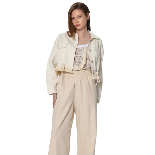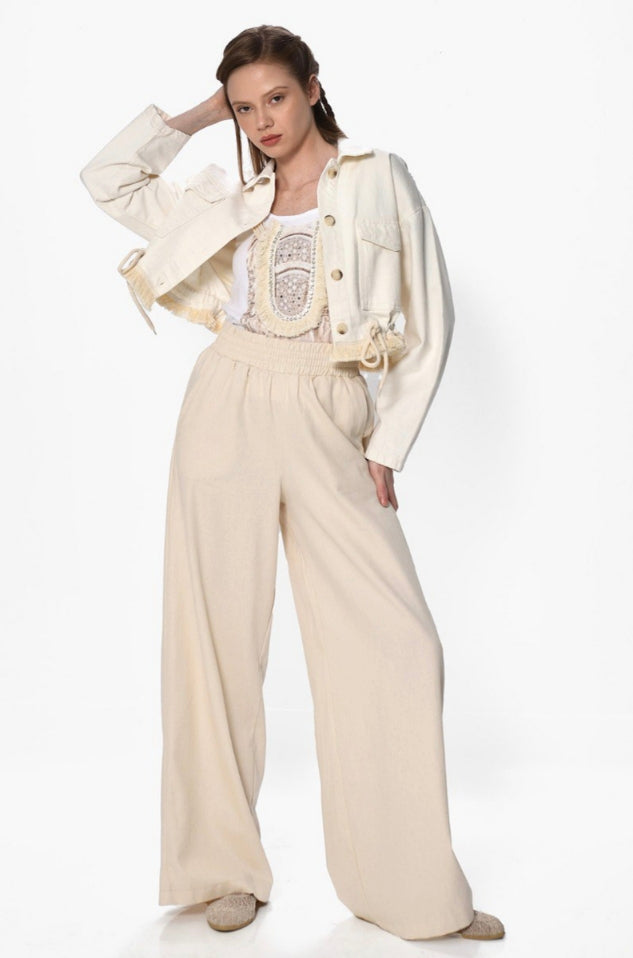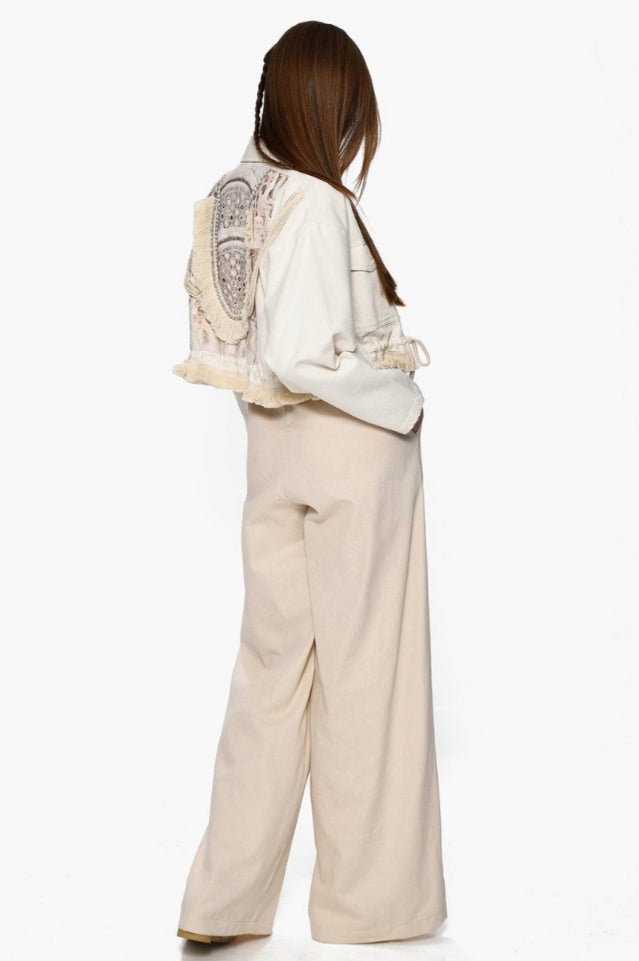 The Statement Jacket: Ένα off-white jacket με άνετη γραμμή και ρυθμιζόμενο κορδόνι στη μέση που δίνει σχήμα χωρίς να περιορίζει. Η πίσω όψη είναι μια ωδή στη δεξιοτεχνία, με εντυπωσιακή πλέξη, κρόσσια και κεντημένες λεπτομέρειες που καθιστούν κάθε κομμάτι μοναδικό.