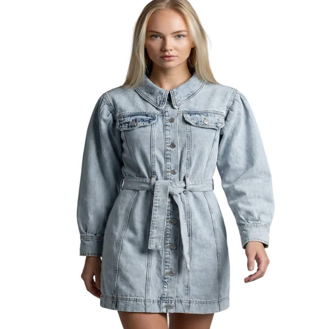Ανανεώστε τη γκαρνταρόμπα σας με το denim φόρεμα με φουσκωτά μανίκια, ένα κομμάτι που συνδυάζει την άνεση του τζιν με τη θηλυκότητα της σύγχρονης γραμμής. Το κλείσιμο με κουμπιά σε όλο το μήκος και η ζώνη από το ίδιο ύφασμα αναδεικνύουν τη σιλουέτα, ενώ τα balloon μανίκια προσθέτουν έναν αέρα κομψότητας και ρομαντισμού.