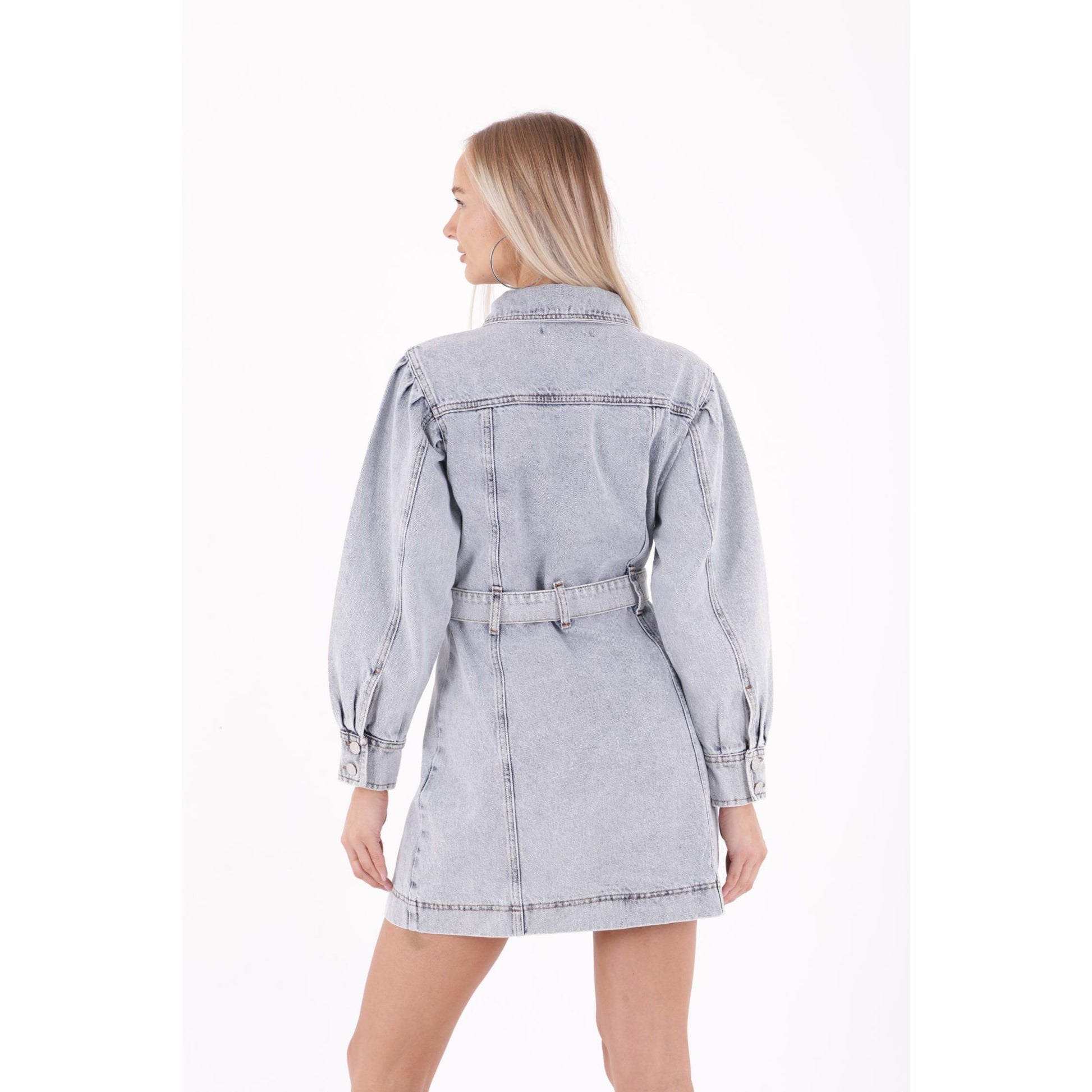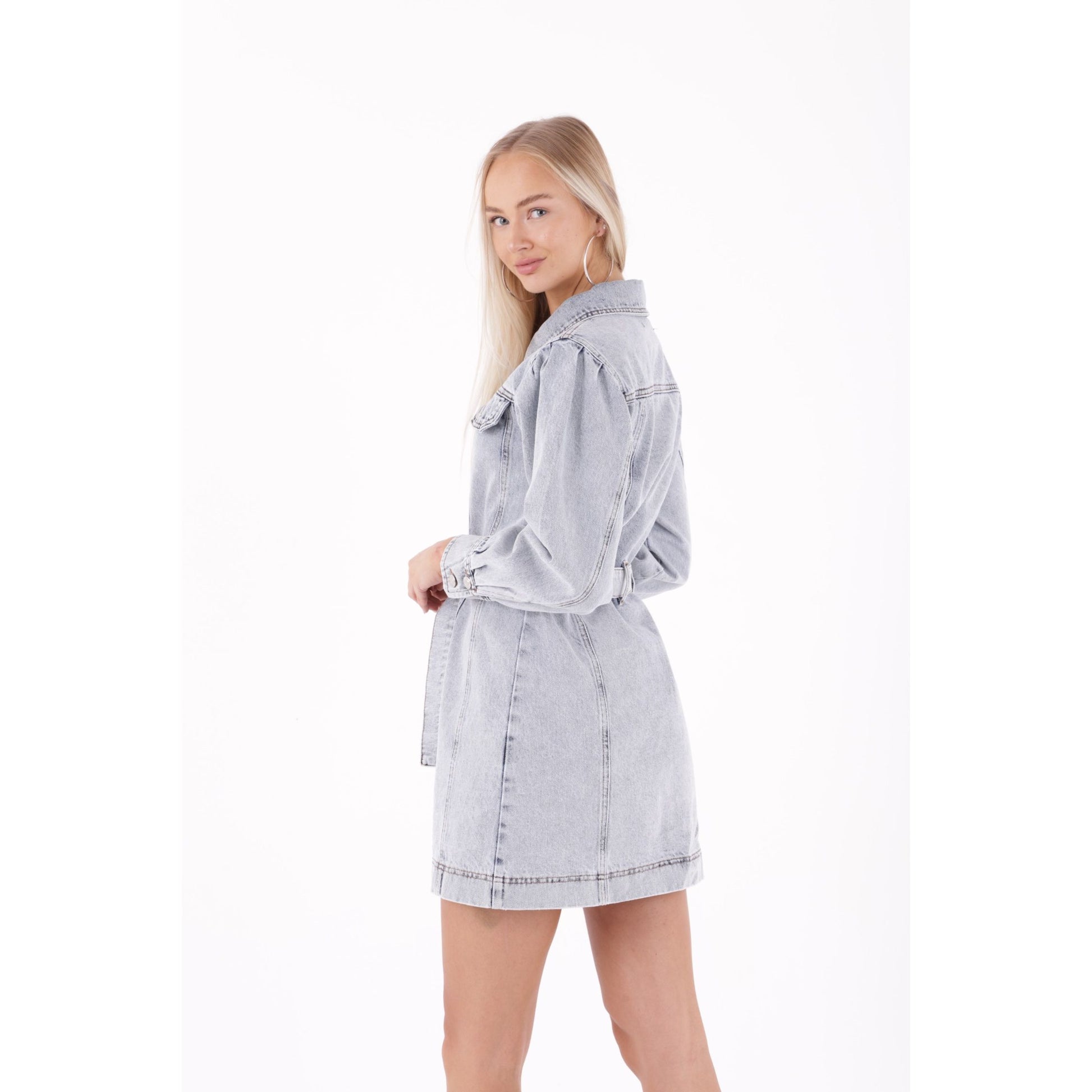 Φόρεμα τζιν με κουμπιά και μπαλονέ μανίκια – Ανοιχτό γκρί