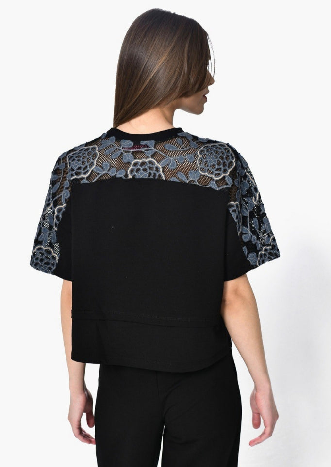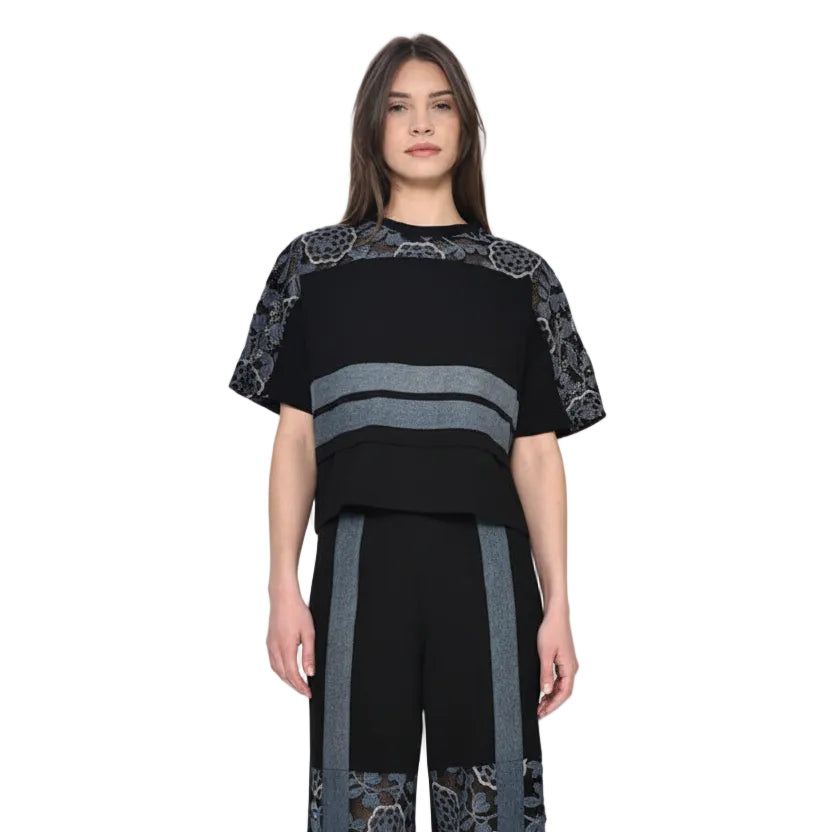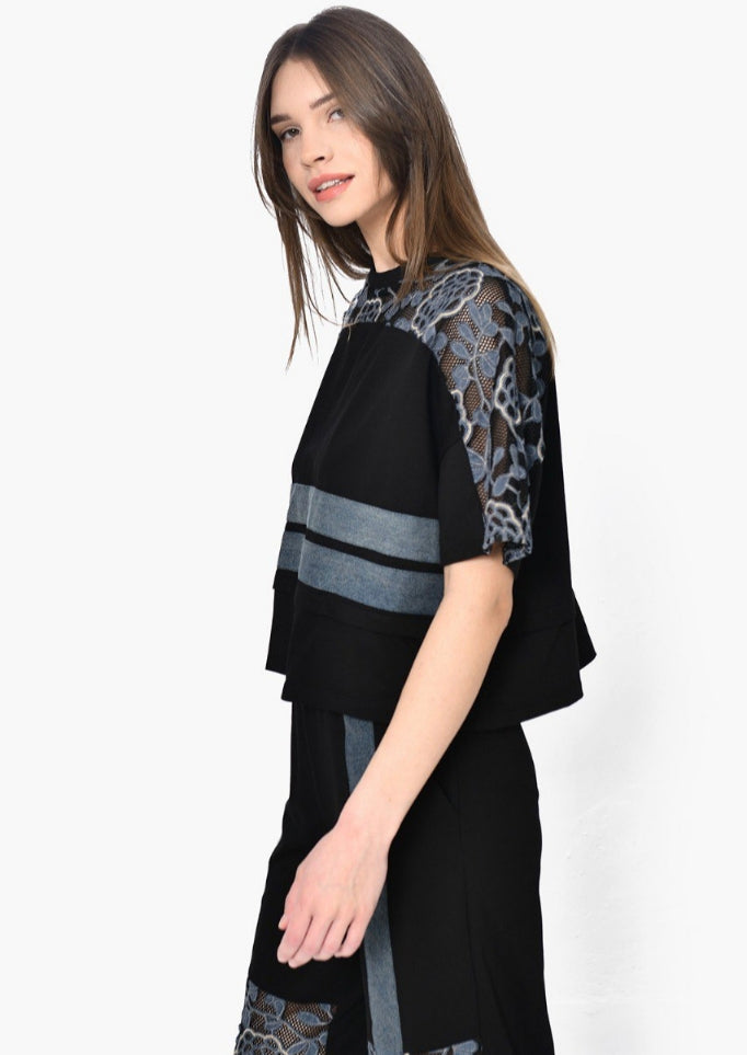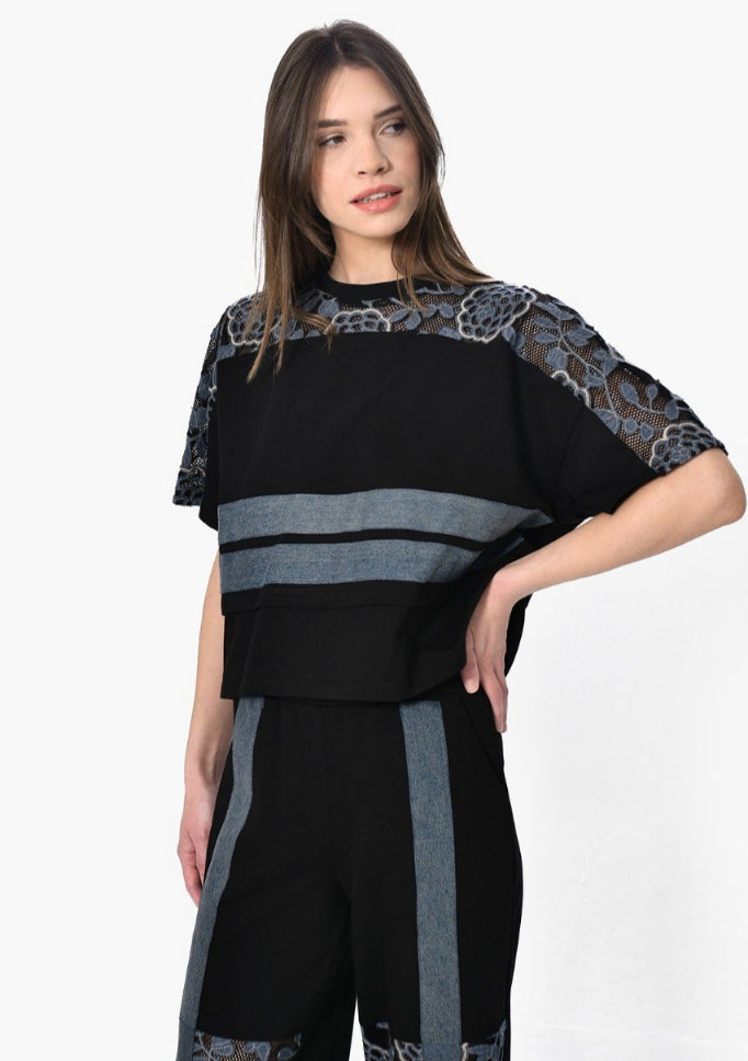 Τοπ με Δαντέλα: Ένα boxy top με καθαρές γραμμές, που αναβαθμίζεται από την περίτεχνη, ανθεκτική δαντέλα στους ώμους και τα μανίκια. Οι οριζόντιες denim λεπτομέρειες δημιουργούν μια αρχιτεκτονική αντίθεση που κλέβει τις εντυπώσεις.