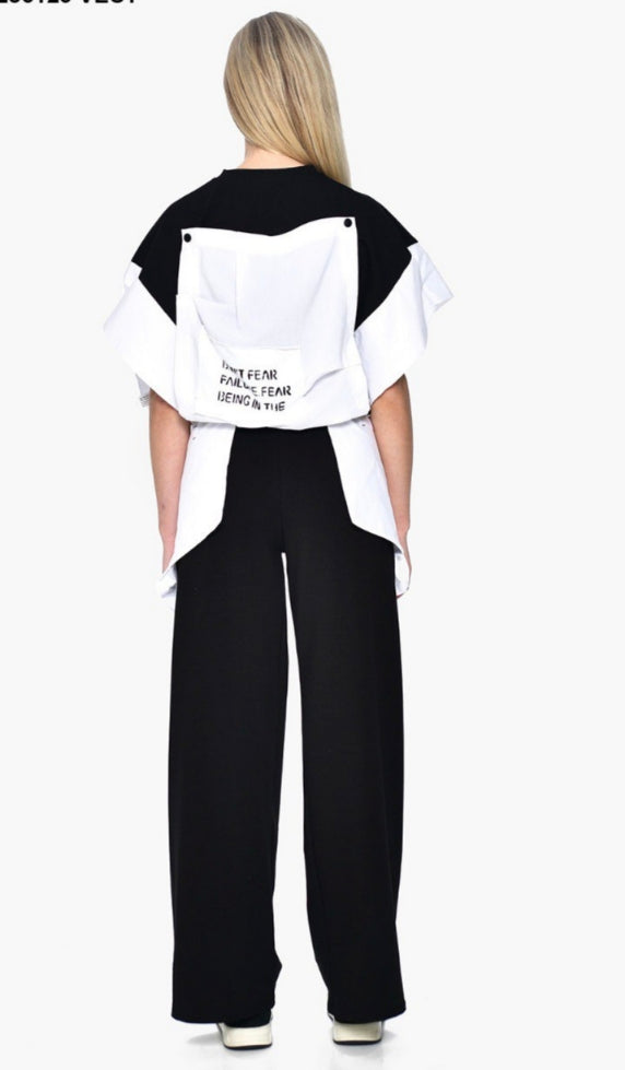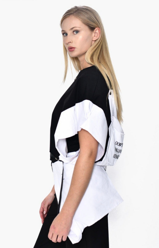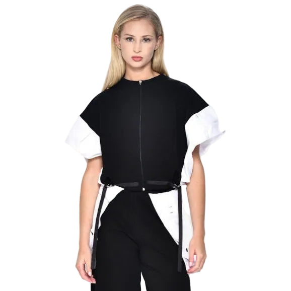 Deconstructed Zip Top: Ένα ανατρεπτικό top με έντονες χρωματικές αντιθέσεις σε λευκό και μαύρο. Διαθέτει φερμουάρ, ρυθμιζόμενα κορδόνια στη μέση για εξατομικευμένη εφαρμογή και statement μανίκια που δημιουργούν μια δυναμική σιλουέτα. Στην πίσω όψη, οι λεπτομέρειες με typographic prints και τα αρχιτεκτονικά layers δίνουν μια urban-luxury αίσθηση.