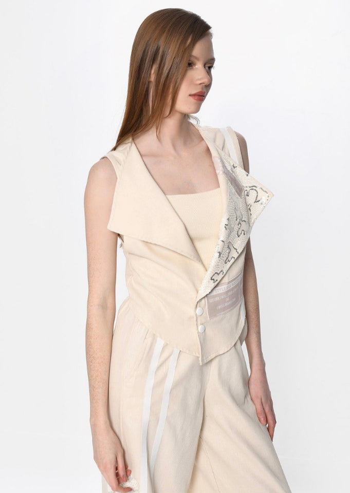 Ασύμμετρο γιλέκο: Ένα κομμάτι-υπογραφή με επιβλητικό γιακά, ανάγλυφες λεπτομέρειες και διακριτικά typographic στοιχεία που προσδίδουν χαρακτήρα.